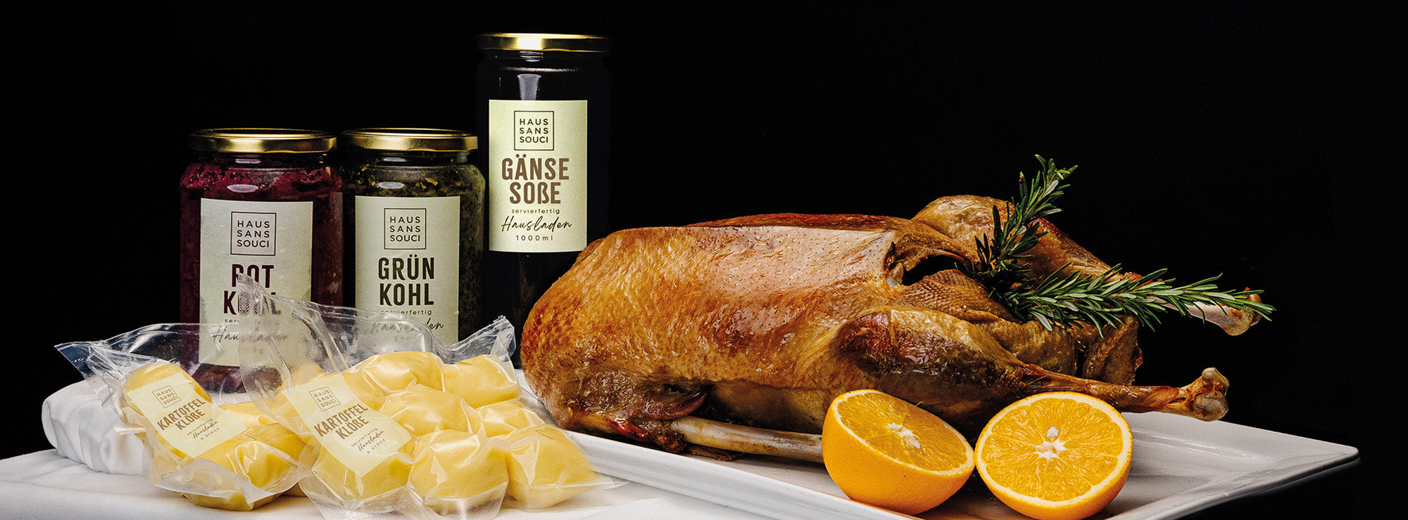 Bei besonders wenig Zeit empfehlen wir die bereits tranchierte Gans, die im eigenen Fett eingegossen ist und problemlos mehrere Tage haltbar ist.