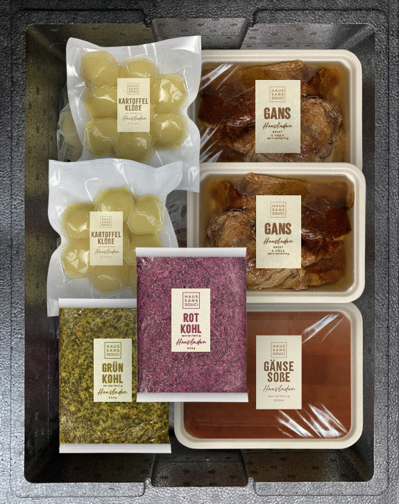Bei besonders wenig Zeit empfehlen wir die bereits tranchierte Gans, die im eigenen Fett eingegossen ist und problemlos mehrere Tage haltbar ist.